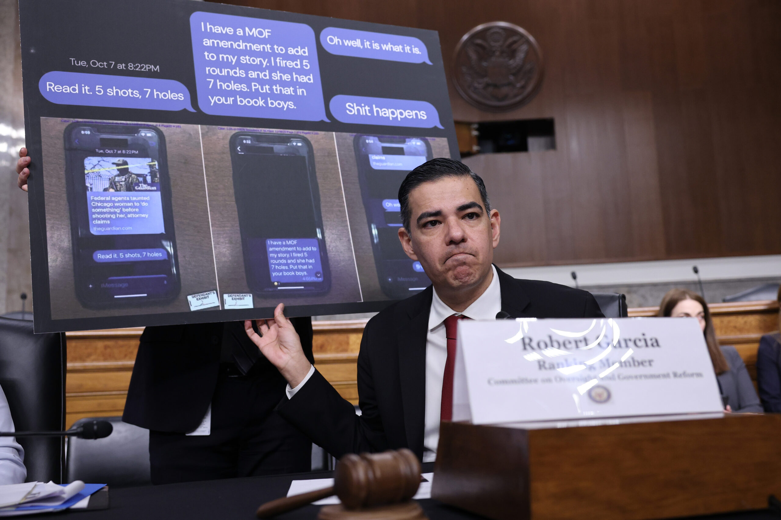 U.S. Rep. Robert Garcia (D-CA) displays text messages sent by Border Patrol Agent Charles Exum during a February 3, 2026 public forum in Washington, D.C.