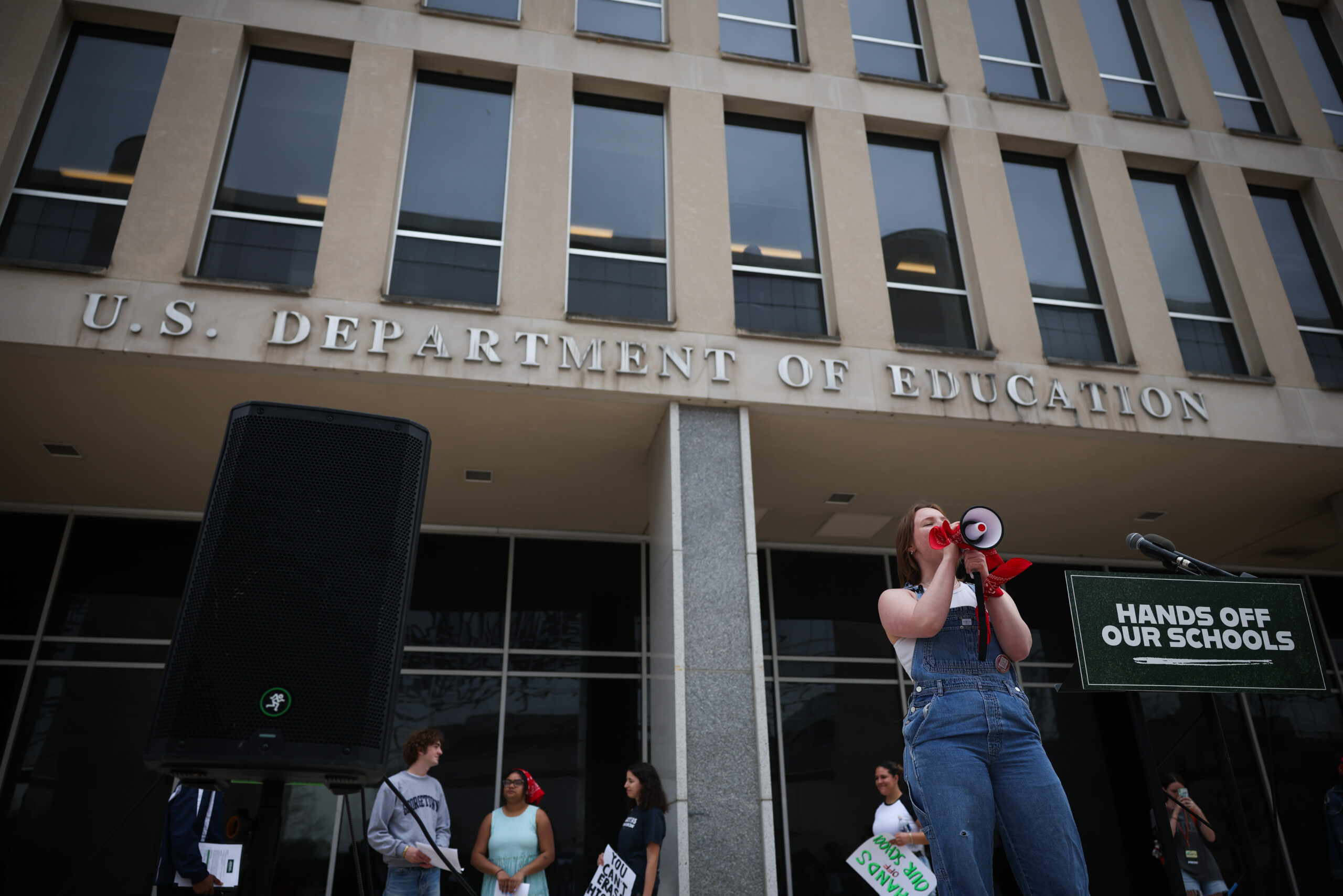 Protesters hold a rally in opposition to the Trump administration’s efforts to dismantle the U.S. Department of Education in Washington, D.C. on April 04, 2025. Photo by Kayla Bartkowski/Getty Images.