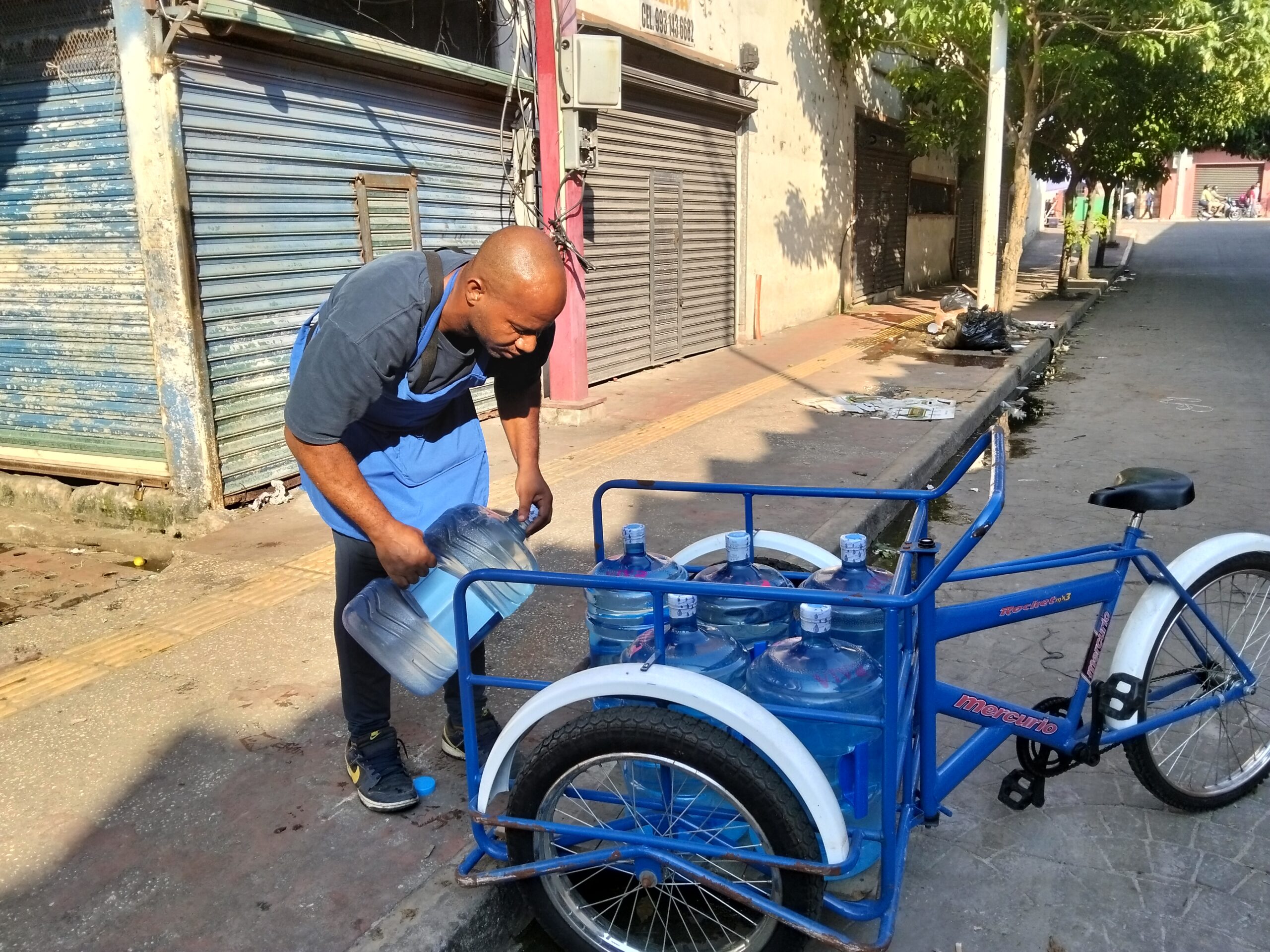 Yamil loads jugs of water onto a tricycle for delivery.