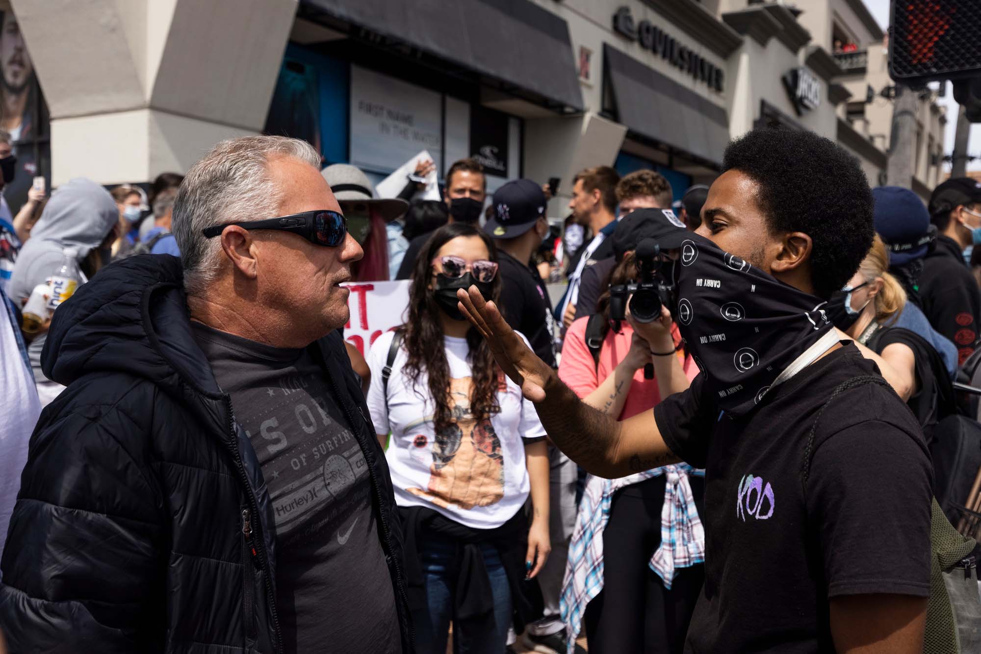 Media crowds around a man with a skull and crossbones tattoo that resembles a Totenkopf while he speaks with Black Lives Matter Huntington Beach founder Tory Johnson. According to the Anti-Defamation League, the Totenkopf is “a symbol used by Hitler's SS that has been adopted by neo-Nazis and white supremacists since World War II.” The bearer claimed it was a military tattoo and was not a racist symbol.